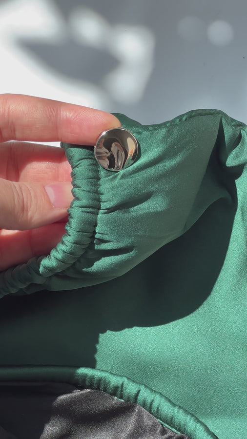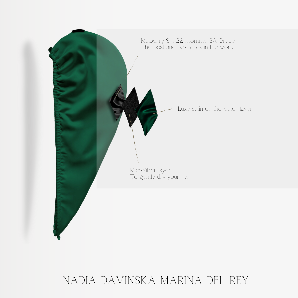 - When wearing a Nadia Davinska turban, the only fabric and material that your hair touches is natural mulberry silk. The water absorbent layer (microfiber) is HIDDEN under the silk layer to avoid any friction and damage to your hair.